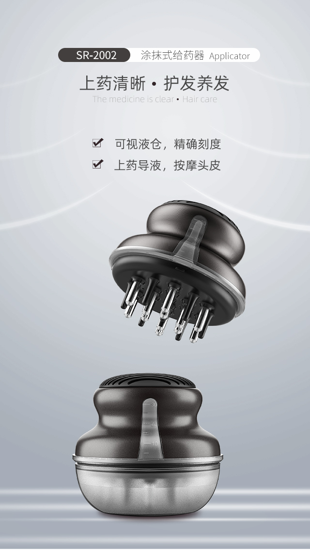 4.握住涂抹式给药器,取下透明盖,将伸缩笔在皮肤表面(如头皮)适当力度按压并顺畅滑动,将液体涂抹于皮肤表面(如头皮)上。